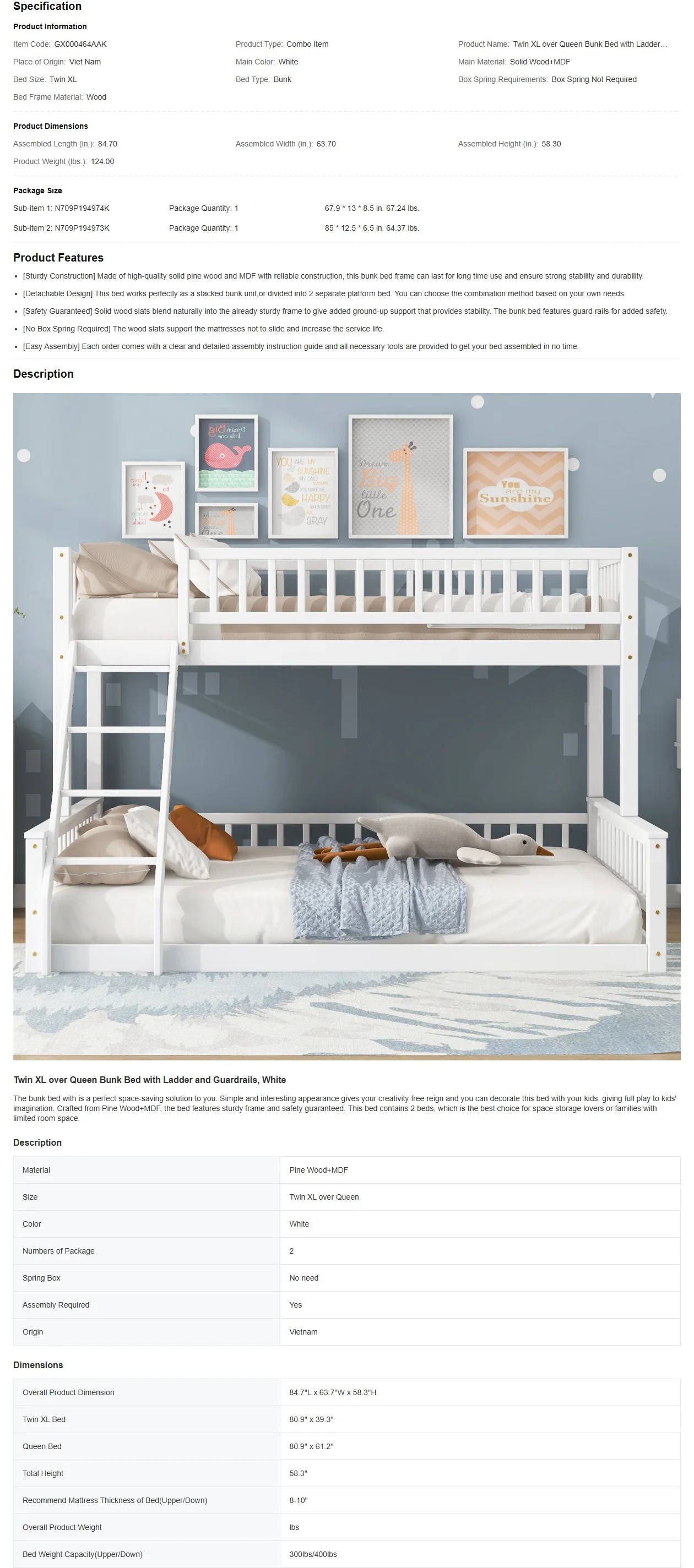 **Twin XL over Queen Bunk Bed with Ladder and Guardrails - White Finish** **Expanded Title:** Stylish Twin XL Over Queen